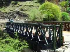 端应急场景(如地震后的废墟通道、陡峭山地救援)中,地形条件恶劣(坡度≥15°、地表障碍物多),需选用轻量化的铝合金折叠钢便桥(材质为铝合金)。其自重较守旧钢材减轻 40%-60%,单模块重量≤500kg,可通过人力搬运至复杂场地,跨度控制在 3-8m,承载能力 3-5t,采用卡扣式连接,拼接速率提升 50% 以上。这类钢便桥的基础要求低,可直接铺设在平整后的废墟或山地表面,通过不滑垫片固定,避免滑动,能在短时间内为救援人员与轻型设备提供通行确定。